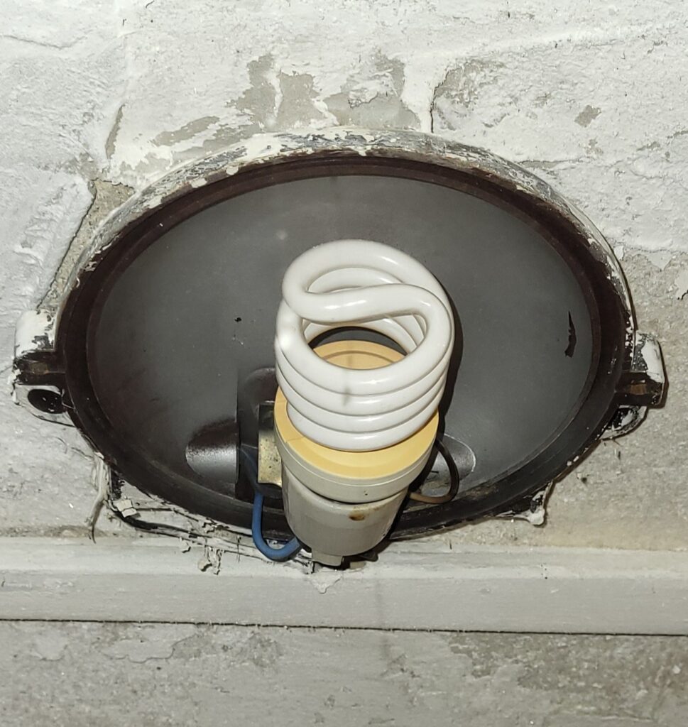 A burkolat nélküli lámpatest nemcsak szabálytalan, hanem életveszélyes is. A látható aktív részek, az izzó foglalat fémfelületei és a szigetelés nélküli vezetékek bármilyen érintkezés esetén áramütést okozhatnak. Ilyen állapotban a világítási rendszer nem felel meg a szabványi követelményeknek, és a felülvizsgáló jogosan adhat „nem megfelelt” minősítést.