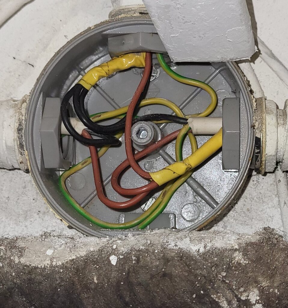 A képen egy klasszikus, de sajnálatos módon máig gyakori szabálytalan villamos kötés látható. A vezetékeket szigetelőszalaggal tekerték össze, érvéghüvelyt nem használtak, a kötés nincs mechanikusan rögzítve, és a kábelek elrendezése is rendezetlen. Az ilyen kivitelezés nem felel meg a hatályos magyar szabványoknak, és komoly biztonsági kockázatot hordoz.
