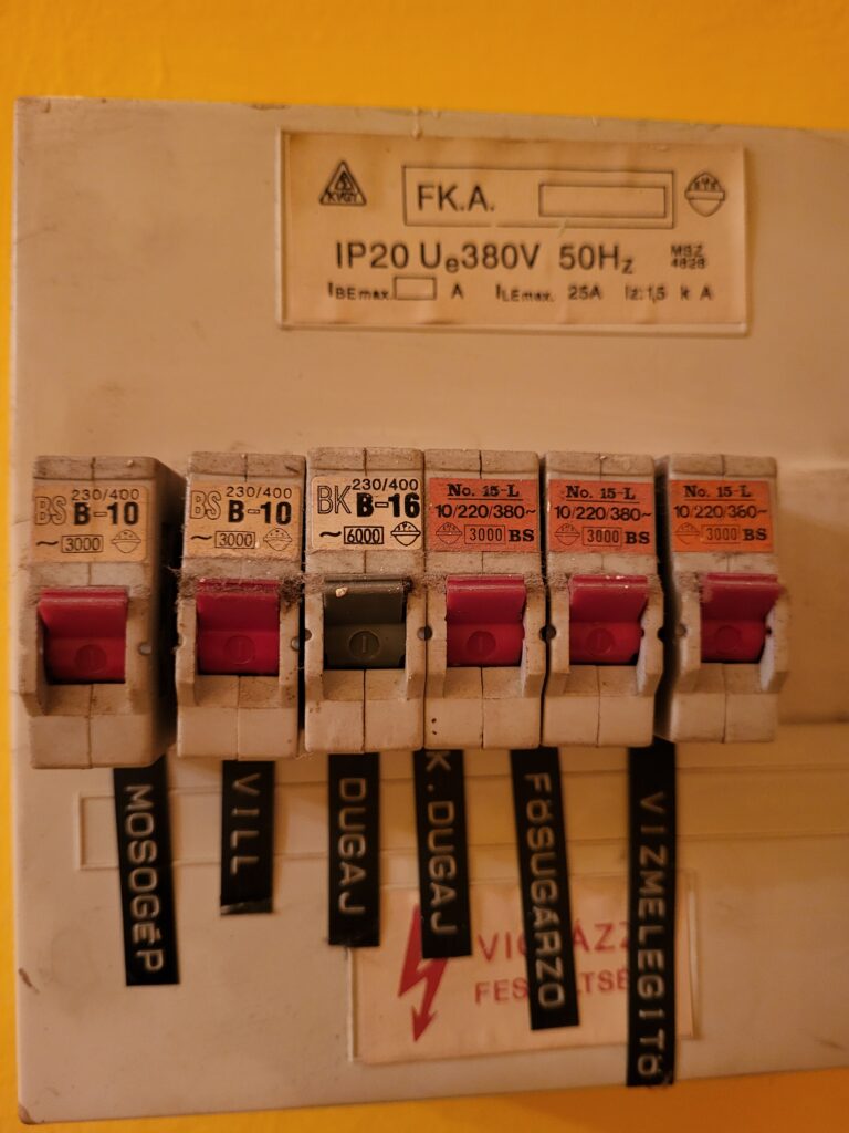 A képen egyértelműen hiányzik az életvédelmi relé (FI-relé), amely már régóta kötelező az új telepítések esetén. Ez az eszköz a szivárgó áramot érzékeli, és életmentő lehet egy testzárlat vagy hibás berendezés esetén.